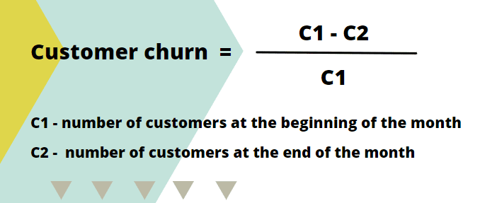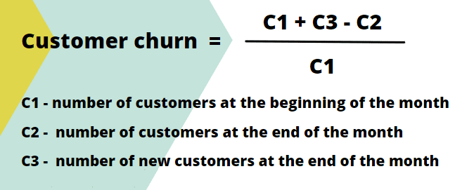 To calculate customers, take the number of customers at the beginning of the month and the number of customers at the end of the month and subtract these two metrics from each other and then divide by the number of customers at the beginning of the month. The lower this number, the better. The number will be expressed as a percentage below is the basic formula.