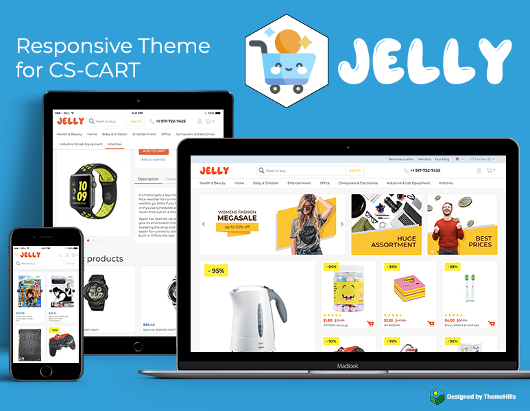 CS-Cart offers responsive design templates for your online marketplace. The image above shows how Jelly uses CS-Cart to design a responsive site.
