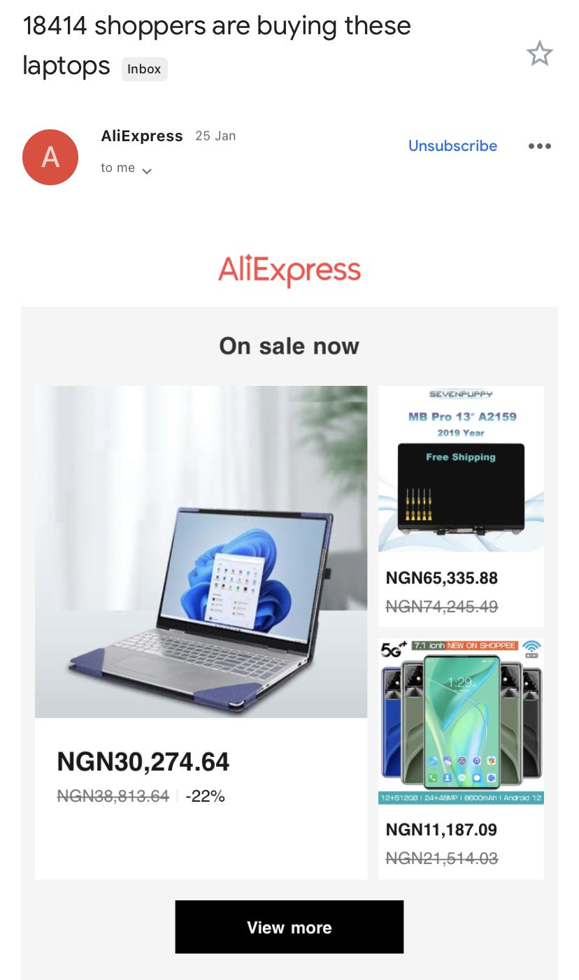 Also, don’t limit yourself to your website. If you have the emails of some of these undecided prospects, send them notifications about popular products to help them make a purchase decision. See how AliExpress also does this below: