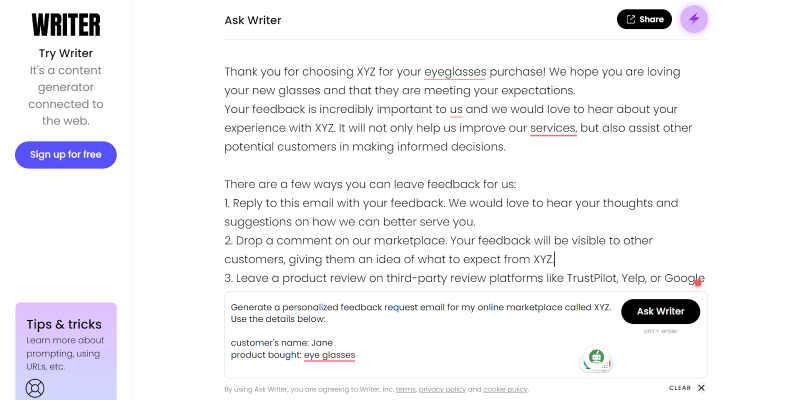 One way is to integrate review automation tools like Truview or Arrivala into your marketplace. These tools can automatically help you ask your customers for reviews after a purchase. Another way is to send personalized emails to your customers, requesting their honest opinion on the product they bought. You don’t have to write these emails manually; use a generative AI platform to automate the process. For instance: