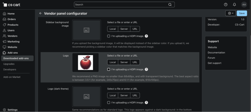 How to upload a logo: Go to Add-ons → Downloaded add-ons → Vendor panel configurator → Settings → Vendor panel style. Recommended logo aspect ratio from 3.5:1 up to 6.1:1.