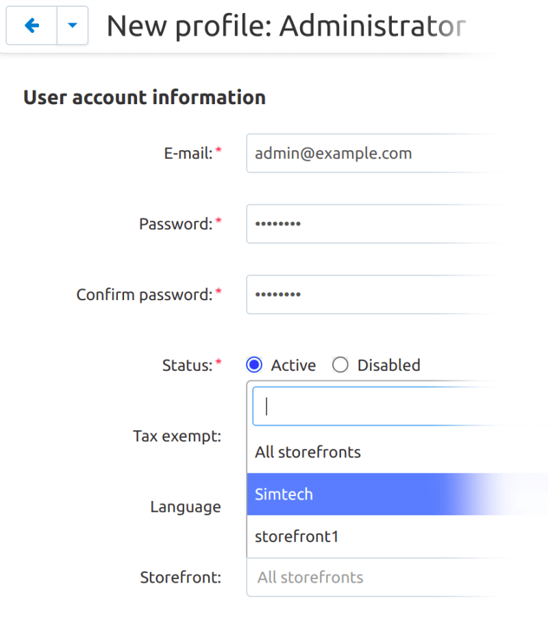 Starting from the version 4.15.1, you can choose, which storefront this or that administrator manages. Such an administrator has access only to those elements on the platform that relate to his/her storefront.