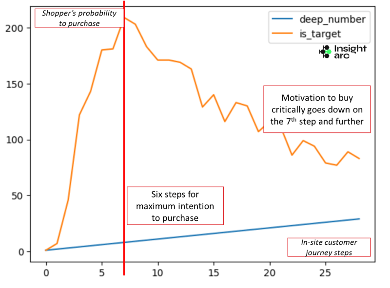 Based on Insightarc.com data, on average, 5-6 steps (clicks) within the marketplace feed augment the likelihood of purchase. However, on the next steps, shoppers tend to leave the site, even without adding products to their shopping cart.