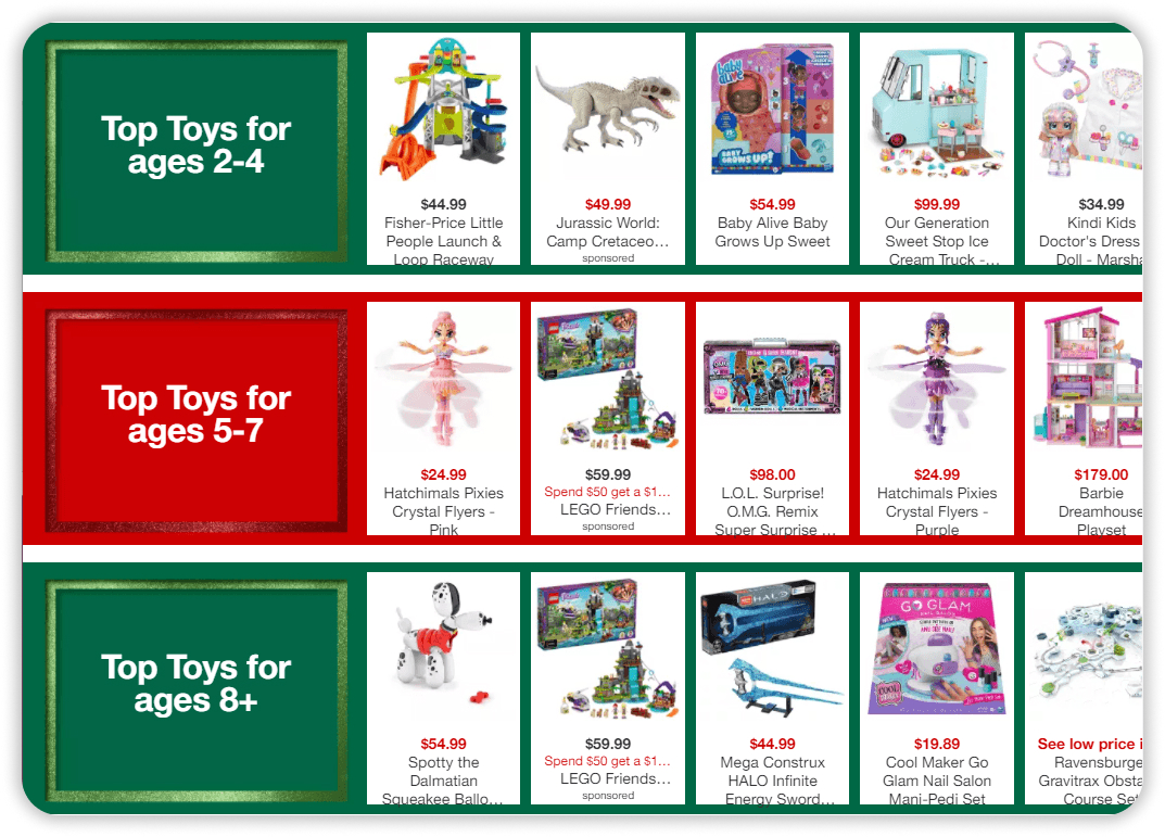 Retail company Target, which has both physical store locations as well as an eCommerce website and a marketplace, launched a gift guide idea. A simple but thoughtful solution: users could choose a gift suitable for a child of a certain age right away on the website.