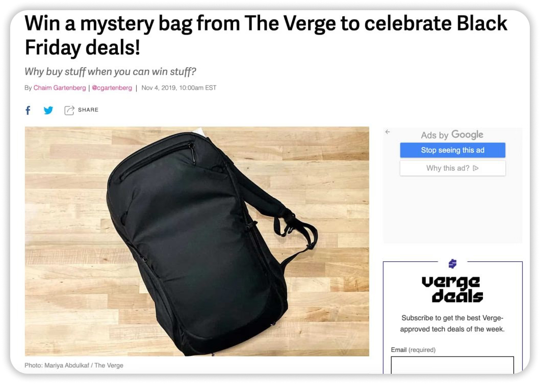 Holiday shoppers love surprises! Mystery boxes concept is nothing new, but it is still widely used and loved by audiences. The Verge, a website whose theme is computer hardware, took it all the way up and did a Black Bag giveaway in honor of Black Friday. This fancy backpack was filled with hardware, gadgets, and other tech goods worth hundreds of dollars. Needless to say, there were plenty of people eager to get their hands on the coveted backpack.