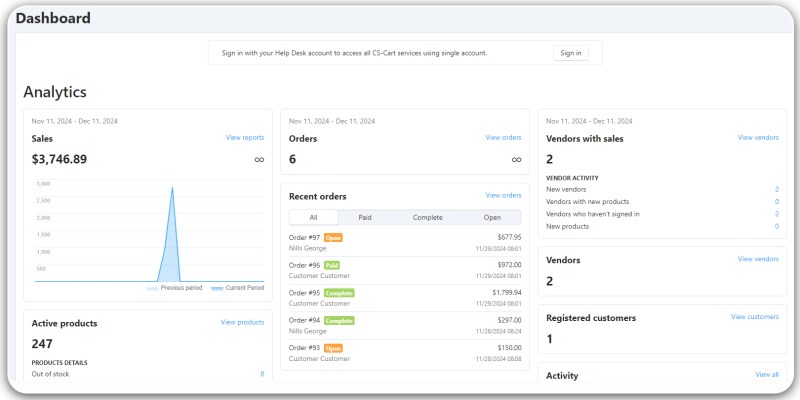 CS-Cart dashboard featurintg in-depth sales analytics