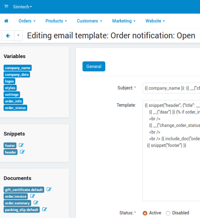• The editor of email notifications allows you to insert documents (for example, order summary) or snippets (specific parts that can be reused in multiple notifications). Now the editing page of every document has the list of email templates where this document is used. Also, the email template editor now has links to the editing pages of documents and snippets.