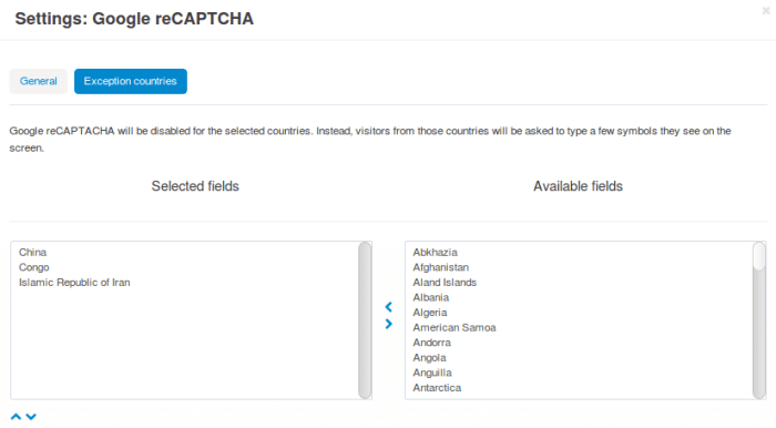 • Some countries (China, Congo, Iran) have Google blocked. Previously, if Google reCAPTCHA anti-bot protection was active on your site, customers from these countries couldn’t confirm they weren’t bots. Now the settings of the Google reCAPTCHA add-on allow you to specify exception countries. Your clients from these countries will see another anti-bot test that will work regardless of whether Google is blocked or not.