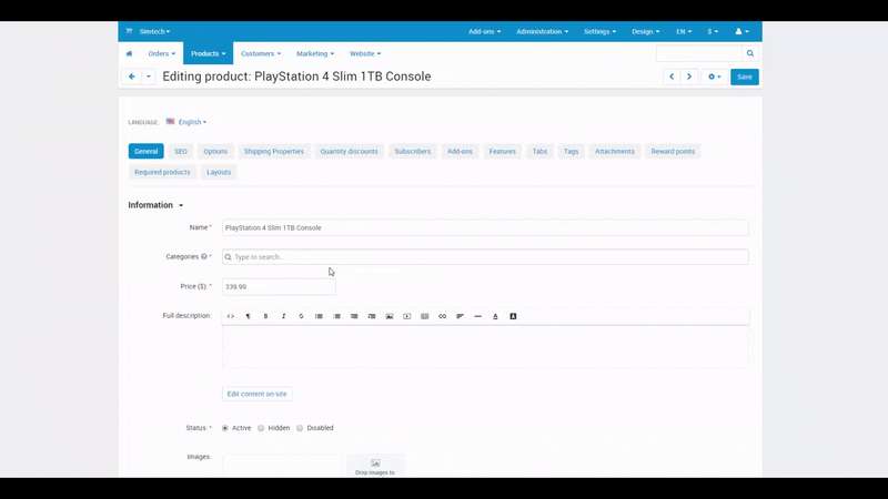 4. Drag & drop of product images has been introduced: you can now upload multiple images for a product at once simply by dragging and dropping them. Also, the main image and the additional images of a product are on the same tab now.