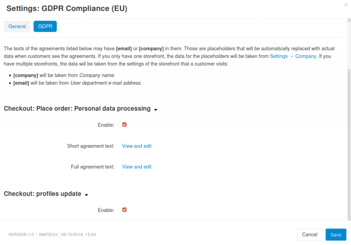 - Previously, the add-on allowed you to specify the company name and email address for GDPR-related matters in the settings. That data replaced the [email] and [company] placeholders in the notifications about personal data processing. But this approach didn’t support multiple storefronts.In version 4.8.1, these settings have been removed from the add-on, and the data is now taken directly from the Company name and User department e-mail address of the corresponding storefront (or from Settings → Company).