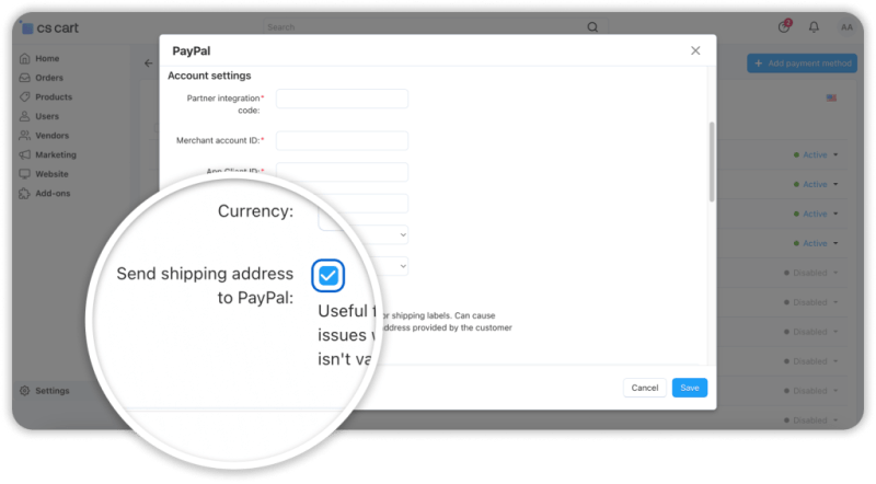 Note: For marketplaces, Apple Pay and Google Pay may not be available at checkout if the cart contains products from multiple vendors. This is a platform-specific restriction imposed by Apple and Google and is beyond CS-Cart’s control.