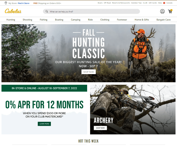 Below we see how Cabela’s shows a special offer and the hot products of the week on their homepage.