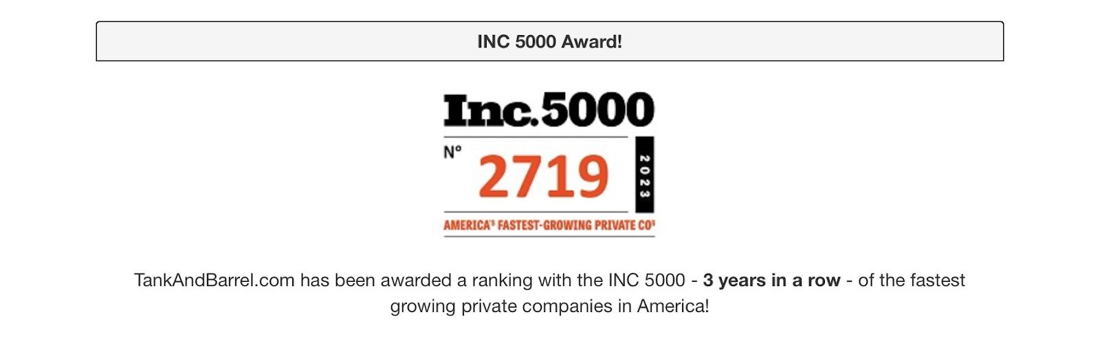 Industry certification and recognition are other options you can leverage. These badges show that your marketplace is industry-recognized and is achieving exploits. Just make sure you go for ones that are relevant to your industry. Examples are INC5000, Organic Food Certification, Handmade Craft Certifications, etc. Here’s how TankAndBarrel show off their INC5000 recognition, for instance: