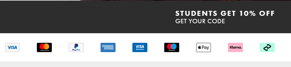 Finally, you can use payment gateway badges to assure potential customers of secure and convenient online transactions. Popular choices are Visa, Mastercard, and PayPal. See ASOS’, for instance.