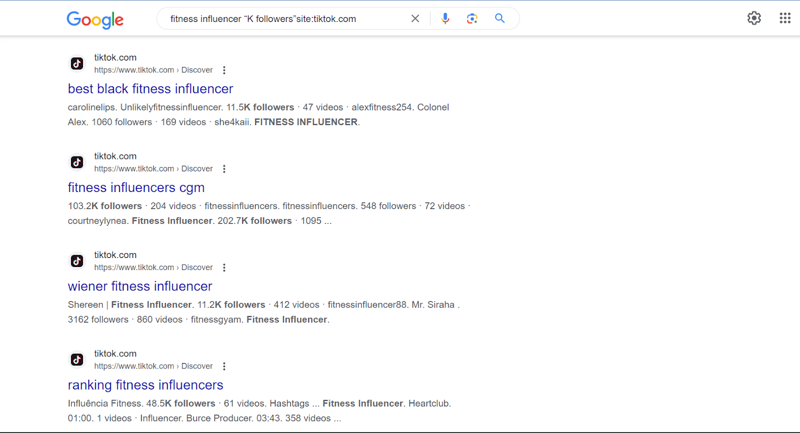 Another option is to use social listening tools—gaining more knowledge on social listening vs social monitoring can also help—such as Brand24 or Hootsuite to see the kinds of discussions happening in the channel. If they’re mostly related to your brand, that’s the confirmation you need.After deciding on the platform(s), move on to search for influencers relevant to your niche there. You can also use an influencer search platform to simplify this process and quickly find relevant influencers for your niche. Simply conduct a Google search using the following format: niche keyword + influencer “K followers”site:yourpreferedplatform.com. This search will return a list of influencers you can go for. Here’s a sample search for fitness influencers on TikTok: