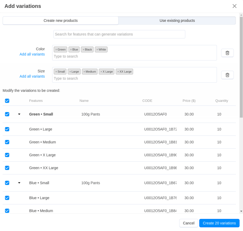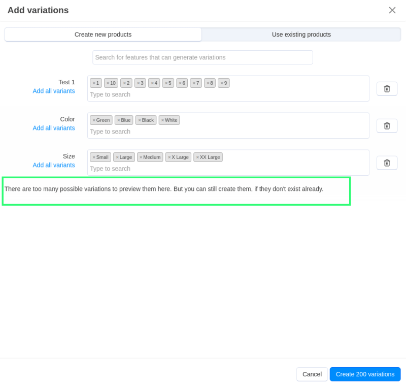 Additionally, we resolved an issue where the variation creation pop-up wouldn’t open if there were too many possible variations. Now, even with a large number of variations, you can still create them, but no editing is possible. It would be inconvenient to edit hundreds of variations manually in a pop-up.