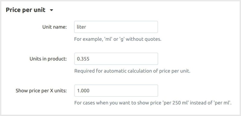 For example, a jar of Coca-Cola 355 ml is on sale. Then, if you want to show the price per liter on the storefront, you need to specify the measurement unit as “liter” and the number of units in the product as “0.355”.