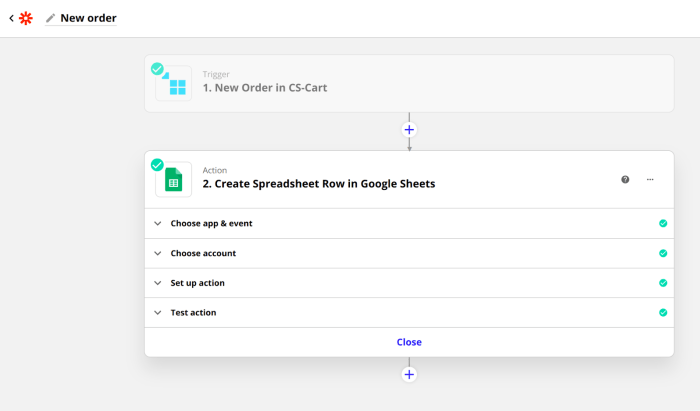 The free Zapier plan allows you to create integrations between two applications or services. So, you can set up notifications about new orders to Slack or to your phone as SMS; automatically share a new product on Pinterest or Twitter, etc. There can be more actions to handle more complex scenarios, like “when CS-Cart receives a new order, take customer’s name from the order and send a welcome email to that customer, if it hasn’t been done before”. But what we like the most are simple things, like adding every new order as a new row in a Google Sheet.