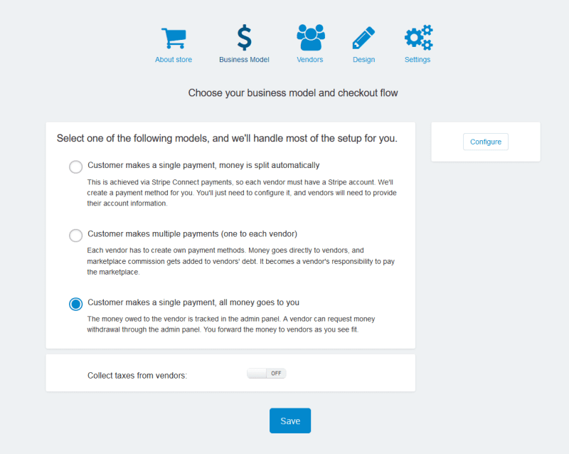 That’s why version 4.13.1 comes with a wizard that guides you through some of the settings just in a few screens. For example, the Business Model screen lets you determine how you accept payments, installs the necessary add-ons, and creates payment methods if necessary. You just need to enter the credentials afterward.