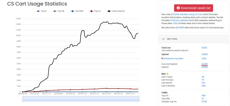 It’s important to note that BuiltWith will not detect CS-Cart if a marketplace admin does not want it to. According to our database, we have over 50,000 stores and marketplaces built with CS-Cart since 2005.