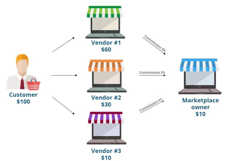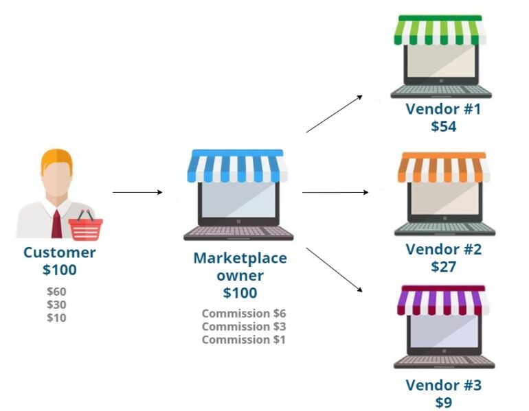 - Customers’ money goes to sellers, then the sellers pay out commissions to the marketplace. This is a convenient method for the marketplace because it doesn’t have to deal with legal and bureaucratic complications.