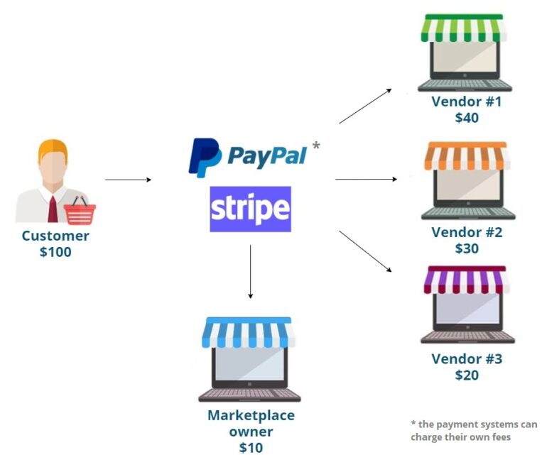 - Customers’ money goes to the marketplace, then the marketplace pays out to sellers. This is the most complicated way to arrange transactions because of the legal regulations but the most convenient in terms of refunds and unexpected cash situations.
